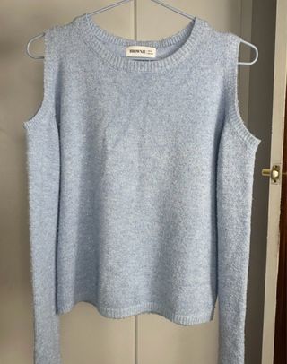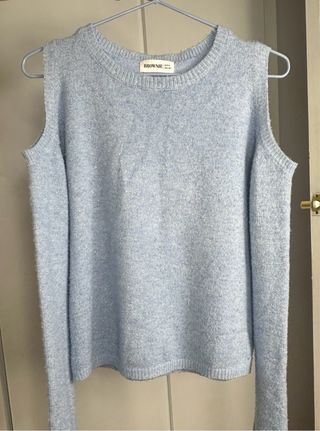 Jersey de punto fino en color azul con un sutil brillo. Diseño con hombros descubiertos. - Manga larga. - Cuello redondo. - Bajo y puños de canalé.