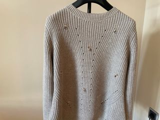Jersey de punto fino en color beige claro de la marca Sfera, con un diseño elegante y femenino. Las mangas largas presentan un bonito detalle fruncido con perlas decorativas, que le dan un toque especial sin perder comodidad. Talla M. Corte recto, cuello redondo y acabado de canalé en puños y bajo. Muy suave y agradable al tacto. En muy buen estado, sin signos de uso destacables. Ideal para looks casuales con vaqueros o para combinar con faldas y dar un toque chic al outfit diario.