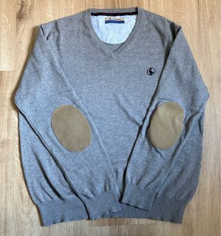 Jersey gris de la marca El Ganso, de punto fino, con cuello de pico y parches en los codos. Talla S. ESTADO IMPECABLE, precio original 60€.