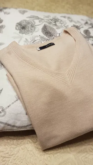 Jersey de punto fino con canalé. Tiene un escote en pico pronunciado, manga larga y tejido elástico. Talla M de H&M, en muy buen estado, poco uso.
