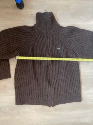 Jersey Lacoste. Color beis. Manga larga con patente. Cintura con patente. Escote en V. Talla 6 (creo que equivale a 2XL). Hecho en España. Pura lana virgen. 5 agujeros más el cuello a arreglar. Largo manga: 67 cm Sisas: 55 cm Largo: 71 cm