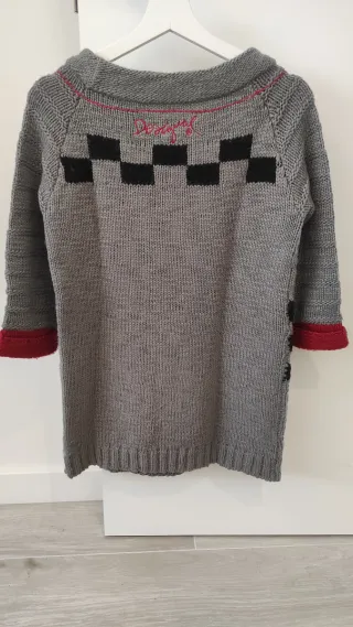 Jersey de la marca Desigual, talla S. Tejido en lana, y de colores gris, rojo y negro. Detalle bordado en espalda y parte inferior derecha.