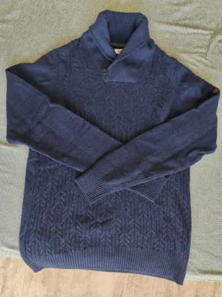 Jersey de lana Barbour en color azul, con detalles de parches en los codos. Talla S amplia (como una talla M). - Cuello alto con botones. - Puños y bajo de canalé. - Parches de ante en los codos.