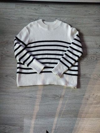 Suéter de punto fino en color negro, cuello redondo con detalle de líneas grises. Pone 6XL pero yo creo que le corresponde la XL. Adjunto medidas en las fotos. Tejido suave y ligero. Puesto dos veces. Muy chulo pero no soporto la lana. Entrega en mano.