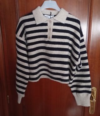 Jerséi de rayas, tipo cropped. Corto, con cuello y 3 botones. Marca Bershka Talla S Nuevo con etiqueta Composición: 92% poliéster 6% lana 2% elastano Medidas aprox. Sisa 64 cm Largo 41 cm . Colores negro y beige. Más productos en mi perfil. Realizo envíos.