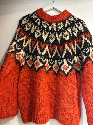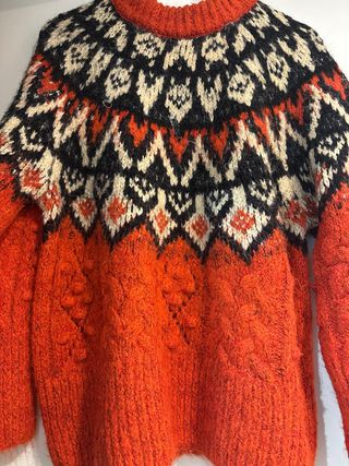 Jersey de lana de color rosa con un diseño divertido. Muy buen estado - Detalle de corazón en la manga izquierda. - Detalle de estrella en la manga derecha. - Tejido de punto grueso.