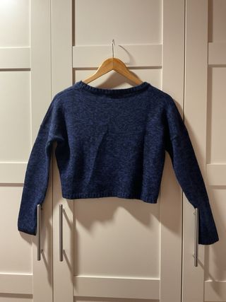 Jersey de lana color azul en talla M de la marca cortefiel. Cuello en pico con 3 botones que se pueden cerrar. Buen estado sin ningún desperfecto.