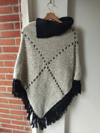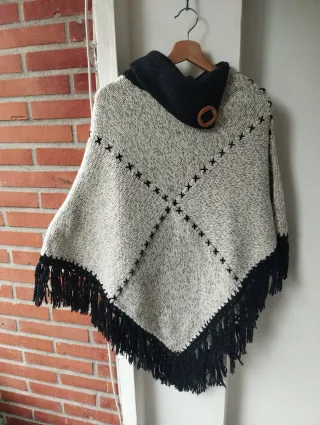 Medidas, en cms. Lana, jaspeado gris y azul marino. 75 (largo) * 90 (ancho). Cuello, lana jaspeada, negro y azul, 7 (largo) * 34 (ancho). Flecos, 12 (largo). Artesanía. Lana de calidad. Lana de Morella. Castellón. Fabricado en España. Capa. Poncho. Unisex. Jersey. Prenda abrigada. No se devuelve. - Lana de calidad. Abrigado. Artesanía. - Cuello alto con detalle de botón de madera. - Adornos de punto en forma de cruz. - Flecos en el bajo. - Gris y azul marino.