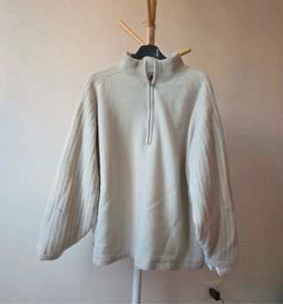 Jersey de lana con un diseño moderno y elegante. Perfecto para añadir un toque de estilo a tu armario. - Cuello alto. - Detalle de costuras blancas. - Tejido suave y cálido. - Talla S pero talla un poco grande