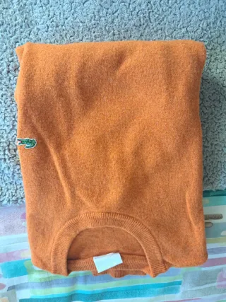 Jersey de punto de cuello redondo de la marca Lacoste en color naranja. Presenta el icónico cocodrilo bordado en el pecho.Talla 7 Usado en buen estado Mide 59 cm de manga,60 cm de ancho,63 cm de pecho y66 cm de largo.El tejido es lana - Cuello redondo. - Manga larga. - Tejido suave.