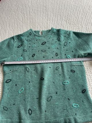Jersey de lana fina con un bonito estampado bordado en tonos turquesa con hilo de plata - Manga francesa. - Cuello redondo. Se adjuntan medidas