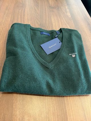 Jersey Gant de lana color verde botella para chica. Cuello en V. Talla S. Está sin estrenar, fue un regalo de talla equivocada que no pudimos descambiar porque se nos pasó el plazo.