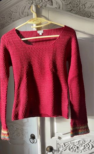 Jersey de manga larga con un diseño texturizado en punto de color rojo granate o burdeos. Hay algo de lana en su composición. Puños de las mangas con detalle de rayas multicolor. De la Marca Etam y talla 36 o S. Usado pero le queda vida. Alguna bolita a cortar.