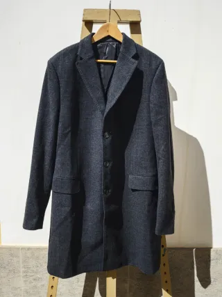 Abrigo masculino de la línea Tailored de Mango Man, de corte clásico y elegante. Largo medio, ideal para otoño e invierno. • Color gris oscuro con cuadro tipo príncipe de Gales muy sutil • 52% lana, 48% poliéster • Forro interior completo (mangas 100% poliéster / cuerpo poliéster y viscosa) • Cierre frontal de 3 botones • Dos bolsillos delanteros con solapa • Bolsillo interior • Corte recto y estructurado Es un abrigo versátil que queda perfecto tanto con traje como con looks más casuales (jersey y pantalón de vestir o incluso vaqueros).4