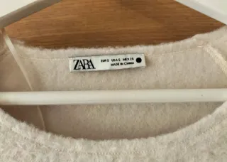 Jersey o top de punto de Zara con un tacto suave y cálido. Talla M, vale perfectas para S. Tejido con lana de manga corta, cuello redondo y detalles en mangas. Conserva la etiqueta, aunque cortada. Tiene una pequeña mancha muy discreta en la espalda que no vi en tienda, como se ve en la foto. Precio original 25.95€