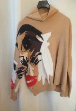 Jersey de lana merino con un diseño artístico y llamativo. - Diseño frontal abstracto con labios rojos. - Cuello redondo y manga larga. - Tejido suave y cálido.