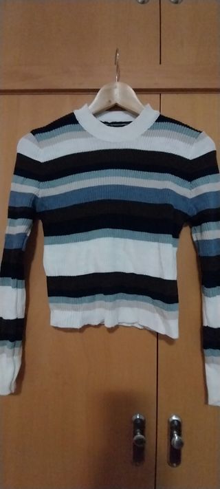 Suéter de rayas horizontales en tonos rosas y grises. Es de punto y tiene un corte cropped. - Manga larga - Medidas: largo 17,4cm; largo mangas 19cm; pecho 21,5cm - Tejido: 52% acrílico, 27% poliamida, 11% poliéster, 7% elastano, 3% lana