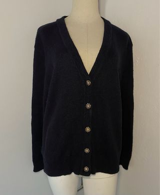 Jersey de color negro. Presenta un cuello en pico y cierre frontal con botones dorados. - Botones con diseño floral. - Manga larga. - 15% Lana Mide de axila a axila 54cm aprox
