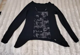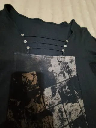 Jersey de manga larga con un diseño moderno y original. - Color negro. - Estampado frontal con efecto texturizado. - Corte asimétrico en el bajo. - Detalle de botones decorativos en el escote.