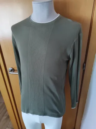 Jersey de manga larga con un diseño de canalé vertical en el centro. - Cuello redondo. - Puños y bajo del jersey con acabado acanalado. - Detalle de ribete blanco en el cuello. Jersei talla M en muy buen estado