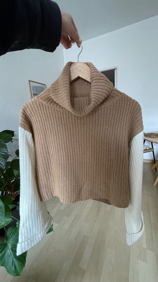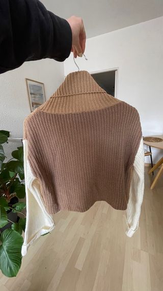 Jersey de punto con cuello alto y mangas largas. Diseño moderno y cómodo. - Tejido de punto grueso. - Combinación de colores marrón y blanco. - Corte cropped.