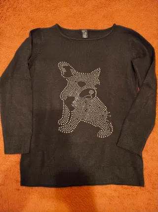 Jersey de punto para niña con un divertido diseño de perro adornado con chapitas plateadas. -Talla 7-8 años. 128cm - Manga larga. - Color gris oscuro. - Cuello redondo. - Tejido suave y cómodo.