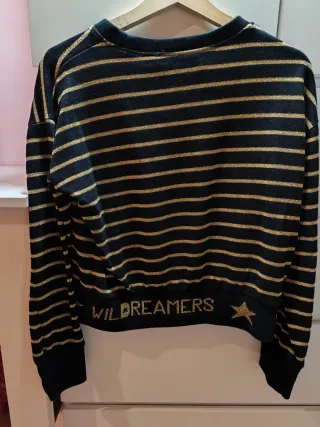 Jersey de rayas doradas sobre fondo negro. - Diseño de rayas horizontales. - Detalle de texto WILDREAMERS y estrella en la parte inferior. - Manga larga.