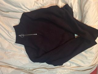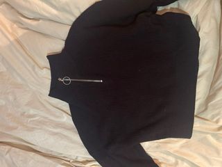 Jersey de punto con cuello alto y detalle de cremallera. No es elástico Medidas: 49 largo, 46 ancho y 56 de mangas - Diseño de canalé. - Cremallera frontal. - Cuello asimétrico.