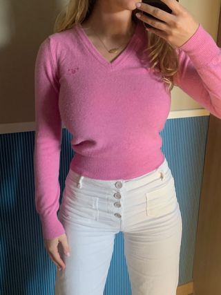 Jersey de pico en color rosa de Gant: - Manga larga. - Puños y bajo elásticos. - Lana + cachemira Defecto en la foro 6, un pequeño agujerito debajo de una de las axilas, a penas es perceptible