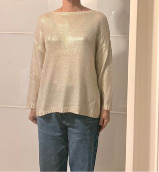 Jersey de punto con hilo metalizado en tono dorado. Un básico con un toque brillante. - Diseño de cuello barco. - Manga larga. - Tejido ligero y con caída.