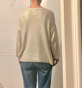 Jersey de punto fino con un toque brillante. Ideal para añadir un detalle especial a tu look. - Cuello en pico. - Manga larga. - Tejido ligero con hilo metalizado.