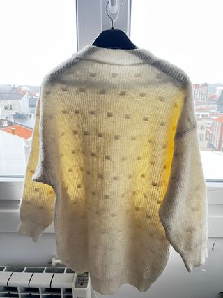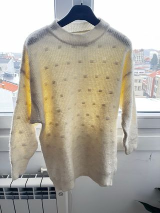 Jersey de punto fino en color blanco roto. Tiene un diseño con pequeños cuadrados en relieve por toda la prenda. - Cuello redondo. - Manga larga. - Corte ancho.