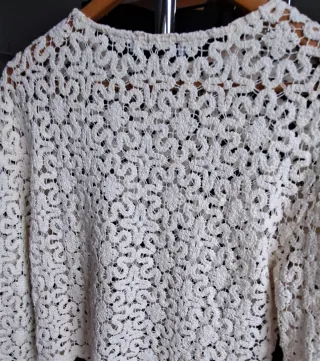 Jersey de Mango con un bonito diseño de encaje color crudo. No se ha utilizado aunque no lleve etiquetas. No tiene ni enganches ni descosidos. 87%de algodón y 13%de poliester. - Tejido calado. - Manga larga. - Cuello redondo.