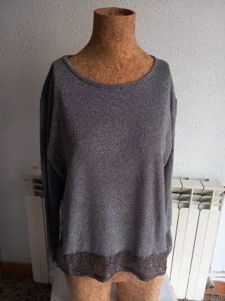Jersey de punto fino con hilo plateado brillante. Presenta un detalle de lentejuelas en el bajo. - Manga larga. - Cuello redondo. - Bajo con lentejuelas.