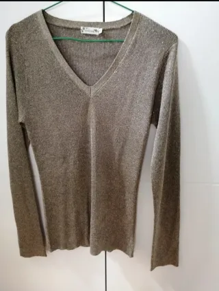 Jersey dorado de manga larga con un acabado brillante y elegante. - Cuello en pico. - Tejido ligero y confortable. - Diseño liso con hilo metalizado. Poco usado y bien conservado Lo vendo porque me queda pequeño Es de punto fino, elástico pero fluido. Ideal para fiesta y cualquier ocasión 39,5 cm de sisa a sisa 65 cm de largo Puede dar un poco más talla por ser elástico Muy rebajado