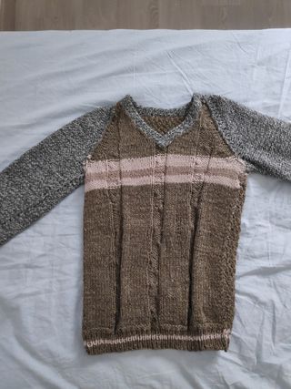 Jersey de punto de lana, tejido a mano con un diseño único. Jersey de punto de Lana hecho a mano. Manga larga con Empuñaduras Elásticas acanaladas. Cuello de Pico o en forma de V, Acanalado. Bajo semielastico Acanalado. Diseño de suéter de punto hecho a mano en tonos marrón y gris, con detalles de rayas horizontales y puntos en relieve. Muy Cómodo, Suave y Abrigable. -Marca: Sin Marca. Hecho a mano, trabajo artesanal. -Composicion: Lana, Poliéster. -Color: Gris, Marrón. -Talla: M. -Estado: Muy Bueno. Prácticamente Nuevo.