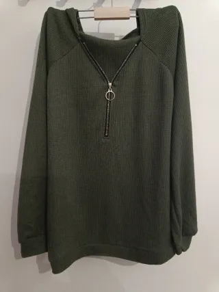 Jersey de punto fino en color verde militar. Presenta un diseño moderno con cremallera frontal. - Cremallera metálica con tirador de anilla. - Cuello cuadrado. - Manga larga. - Tejido texturizado.