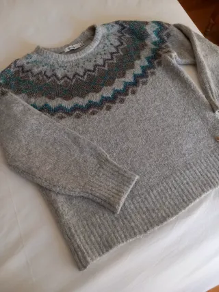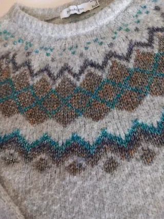 Jersey de punto gris con un diseño de cenefa en tonos azul turqueda con hilo dorado metalizado en en la zona del cuello. Ideal para dias de frio o look navideño . - Cuello redondo. - Manga larga. - Tejido muy abrigado ,ligero suave y confortable.