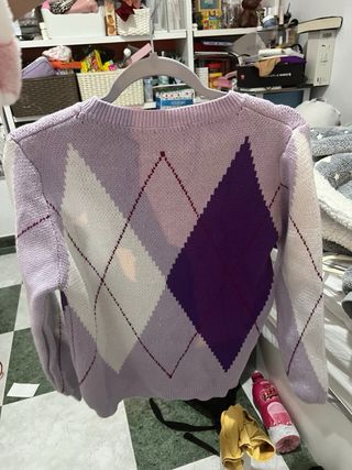 Jersey de punto con diseño de rombos en tonos morados y blanco. Es una prenda cómoda y llamativa. - Diseño de rombos. - Cuello redondo. - Manga larga.