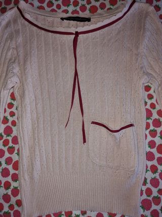 Jersey de Zara con un diseño de punto calado y detalles de flecos en el bajo. Su tonalidad beige con toques rosados lo hace muy versátil. - Punto calado. - Bajo con flecos. - Manga larga.