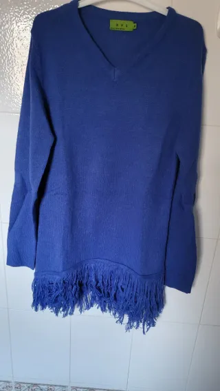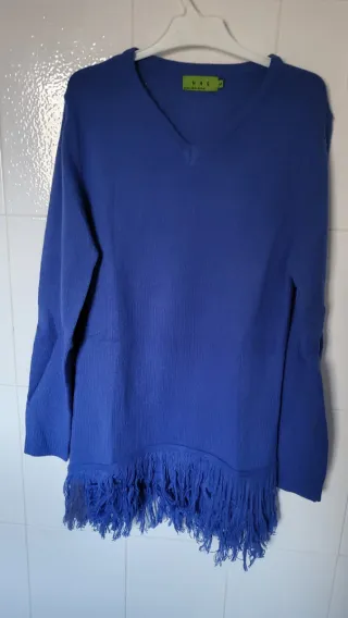Jersey de punto con un diseño moderno y detalles de flecos en el bajo. - Cuello en pico. - Manga larga. - Bajo con flecos decorativos. - Poco uso y da poca talla.