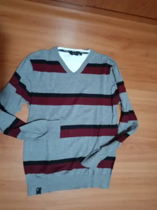 Jersey de manga larga para hombre con un diseño de rayas. - Cuello en pico. - Tejido de punto. - Detalle de etiqueta en la parte inferior.