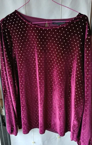 Jersey fino de terciopelo en color vino con un bonito estampado de estrellas doradas. - Tejido suave y agradable al tacto. - Manga larga. - Cuello redondo.