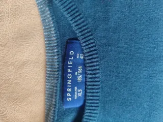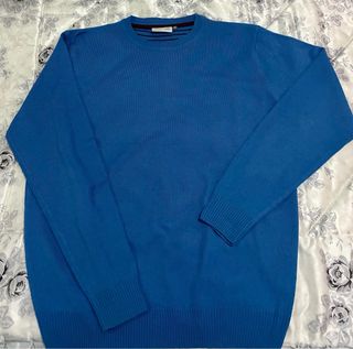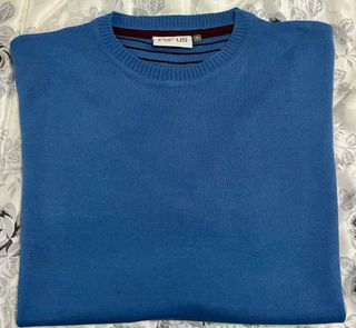 Jersey de punto azul de la marca FOR US. Es una prenda nueva, ideal para añadir a tu armario. Medidas ancho 57cm y largo 72cm, Manga 66cm - Cuello redondo. - Diseño de punto fino. - Detalle de rayas en el cuello.