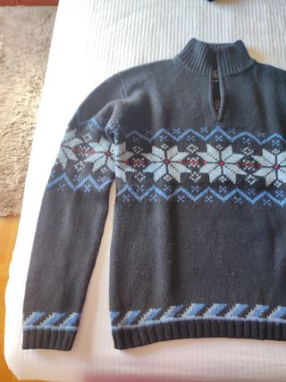 Jersey de punto grueso con diseño de patrón geométrico en tonos azul, gris y detalles en rojo. Tiene cremallera corta en el cuello alto. El jersey viene con bufanda a juego, ideal para completar el conjunto. Medidas del jersey: 56 cm de axila a axila, 50 cm de ancho de cadera, 66 cm de largo. Medidas de la bufanda: 28 cm de ancho, 185 cm de largo.