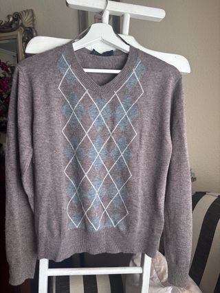 Jersey 20% lana con estampado talla L hilo plata plata, medida sisa 50cm Puesto una ocasion - Diseño de rombos y grecas. - Cuello redondo. - Manga larga.