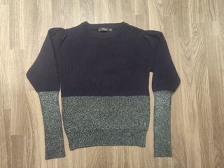 Jersey de punto canalé, ajustado, con el bajo de las mangas y la cintura de color plateado. Cuello redondo. Medidas: 40 cm de ancho, 57 cm de largo.