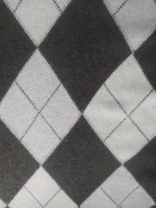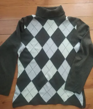 Jersey de punto con cuello alto y estampado de rombos. - Diseño clásico de rombos en verde con gris/amarillo muy claro. - Cuello alto acanalado. - Manga larga. En etiqueta 42 pero hace 38/40 Medidas, sin estirar, de hombro a hombro 38 cm., axila a axila 48 cm. y largo 63 cm.