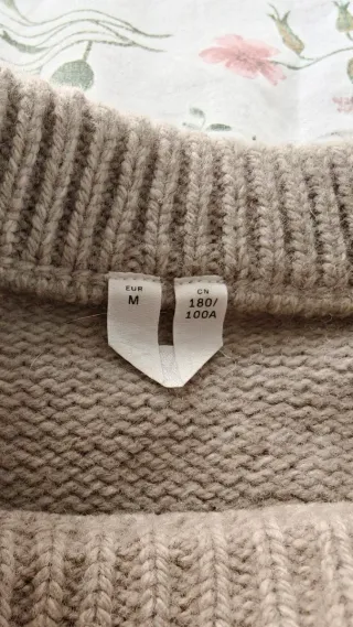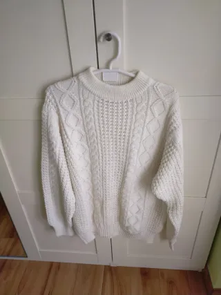 Jersey de punto grueso con diseño trenzado. - Cuello redondo. - Manga larga. - Tejido cálido y confortable.. Es un blanco roto o beis clarito. Lo pongo en aceptable, por algunas bolitas y algún enganche. Pero en general no se ve mal . (Ya está bajado de precio)
