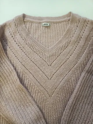 Jersey de punto fino con escote en pico y detalles calados. Medidas: 49 cm de hombros y 55 cm de largo. - Diseño en V con calados. - Manga larga. - Tejido suave y ligero.